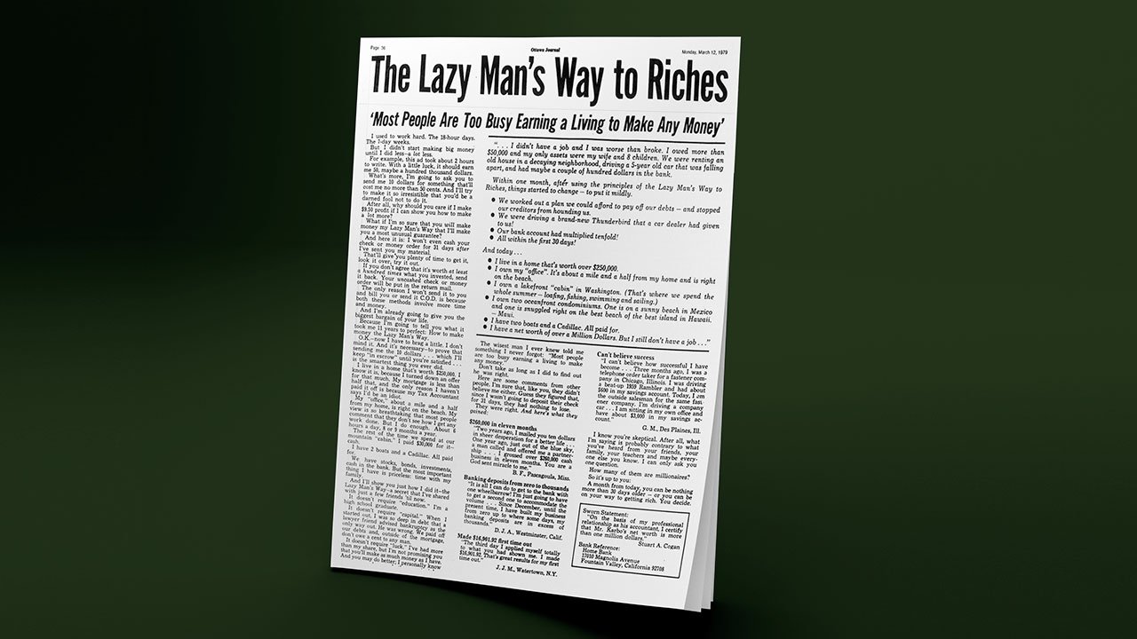 Embora hoje estejamos ainda mais desconfiados de esquemas de ganhar dinheiro, na época, foi uma ideia inovadora enviar anúncios como este para o mercado de massa.