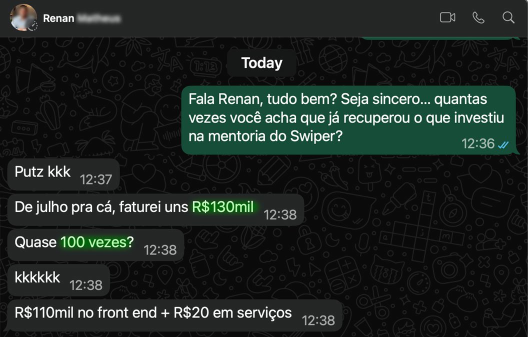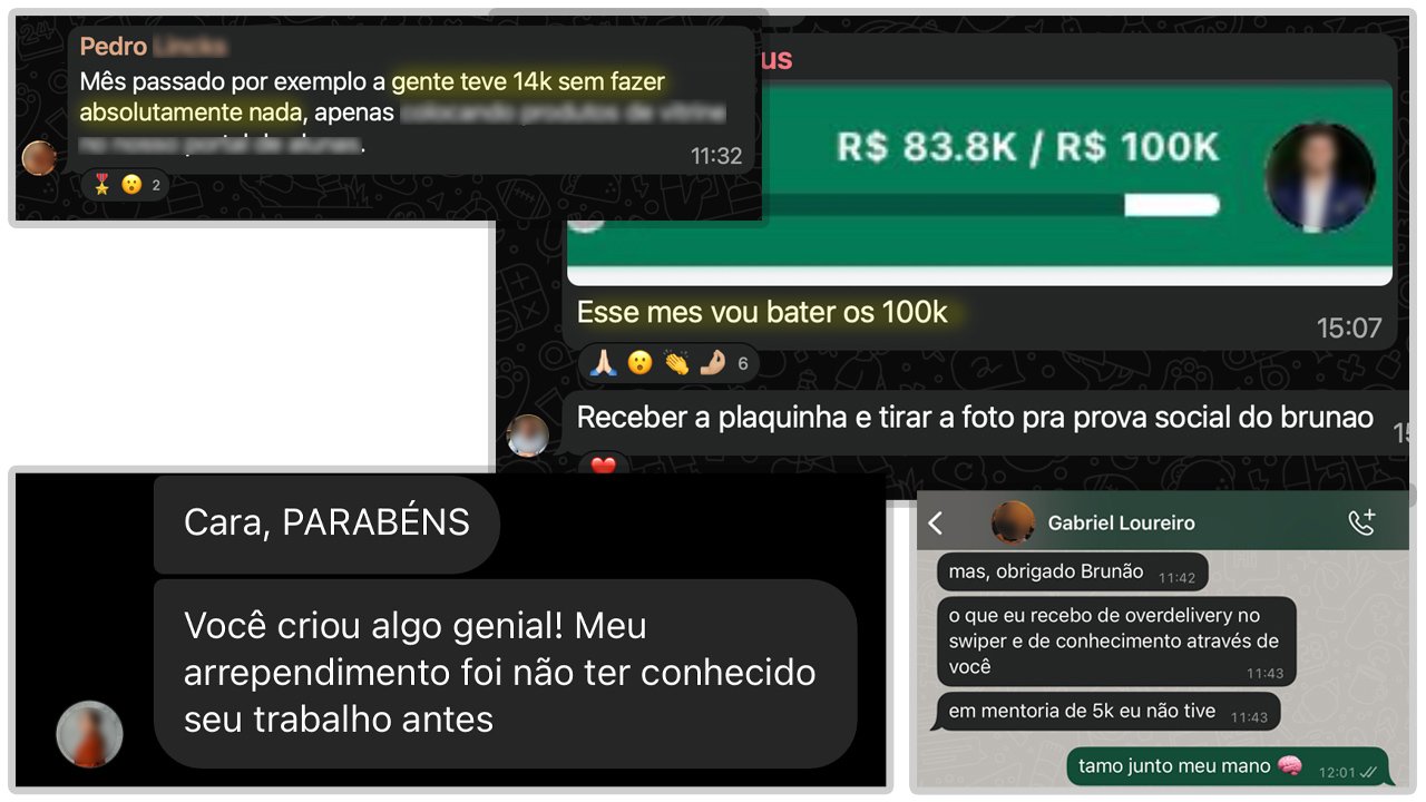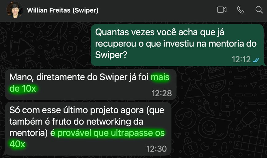 Também faz total sentido. Muitos dos meus alunos e mentorados já eram profissionais de marketing, tráfego, design ou copy antes de entrar e descobriram dentro do Swiper formas de refinar o que já faziam, destravar novas ideias e multiplicar resultados. Além disso, o Swiper Vitalício cresce junto com você.