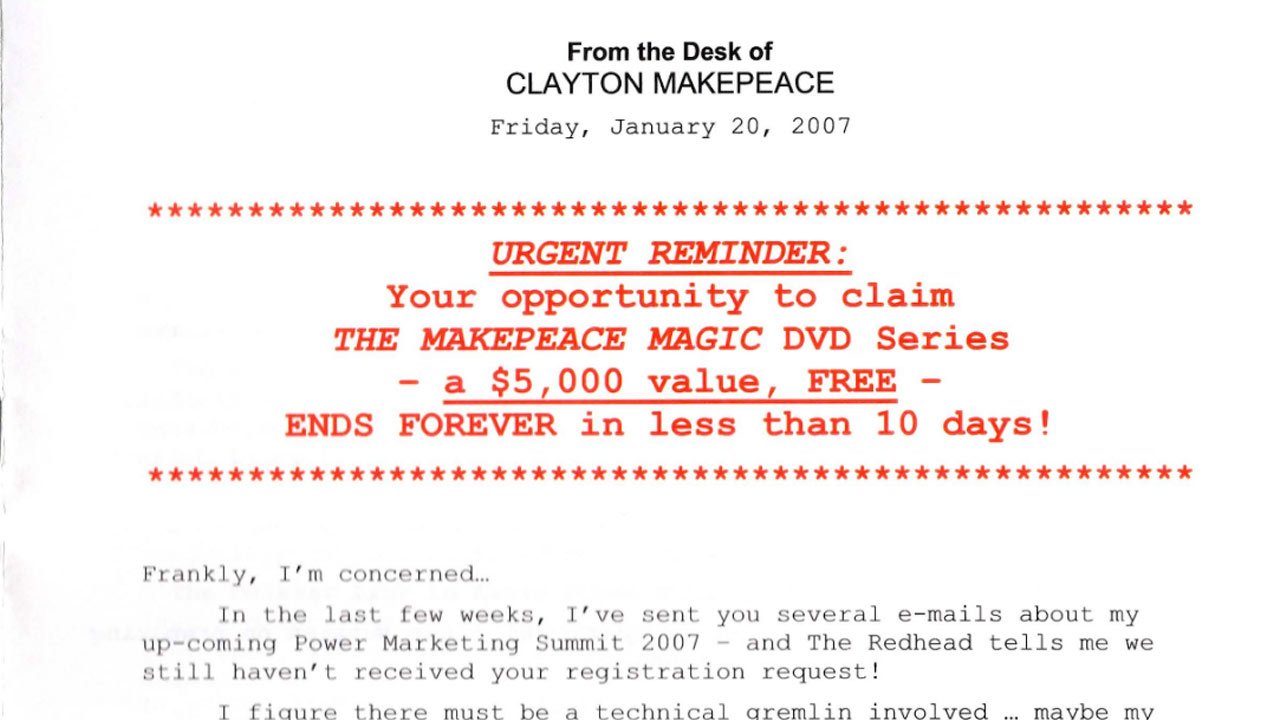 Copy em texto aplicado em uma carta de Clayton Makepeace nos anos 2000. Esse é um ótimo exemplo de uma oferta direta para público quente, com alto nível de consciência.
